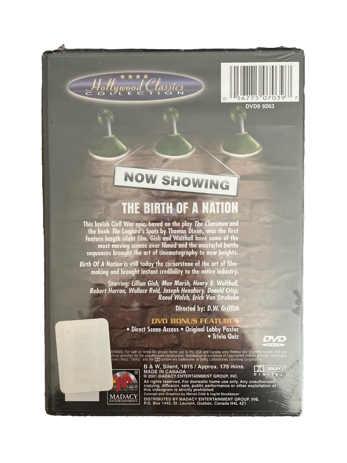 This is a collectable vintage DVD of the 1915 movie "The Birth of a Nation" in black and white. The DVD features the Hollywood Classics Collection edition and is captioned for easy understanding. The movie stars Lillian Gish and is directed by D.W. Griffith, David Wark Griffith, and Granville Warwick. The DVD is in English and has a rating of NR. The movie is a drama genre and is released by Madman Entertainment.