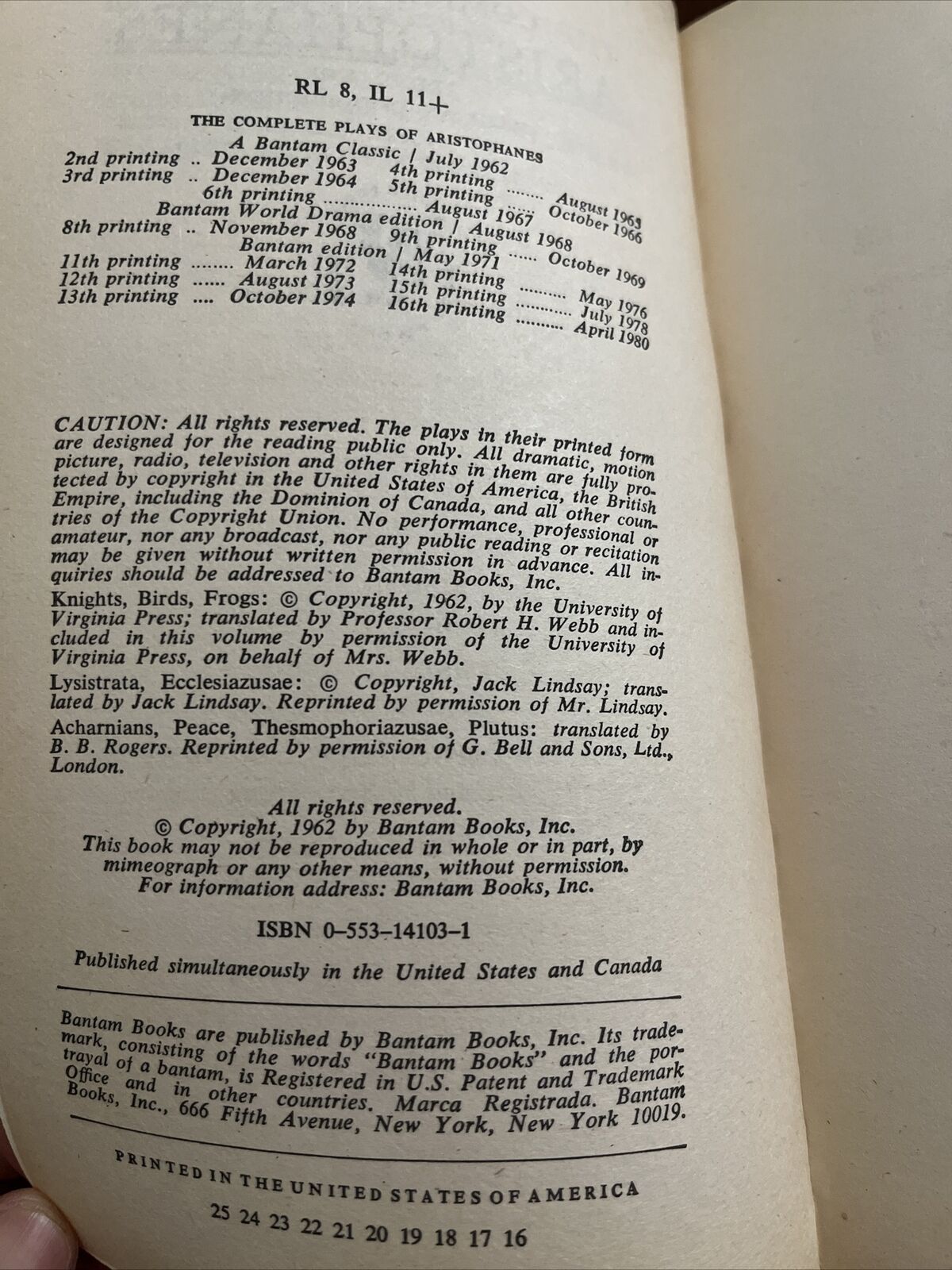 This is a paperback copy of Comp. Plays/Aristoph by Moses Hadas, published by Bantam Books in 1980. The book is in English and weighs 8.6 oz. It is a non-classifiable drama that falls under the genre of general topics. The item is listed under the Books & Magazines and Books categories on eBay.