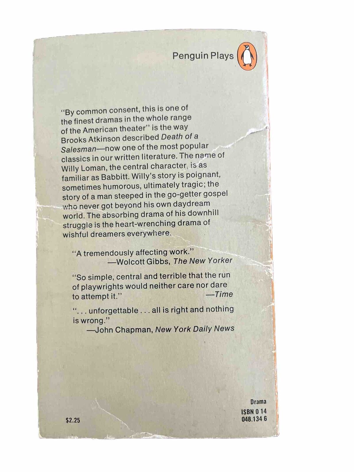 This is a Penguin trade paperback of Arthur Miller's Death of a Salesman. The book measures 7.7 inches in length, 5.1 inches in width, and 0.3 inches in height. It has 144 pages and weighs 3.6 ounces. The book was published in 1976 and printed in 1978.