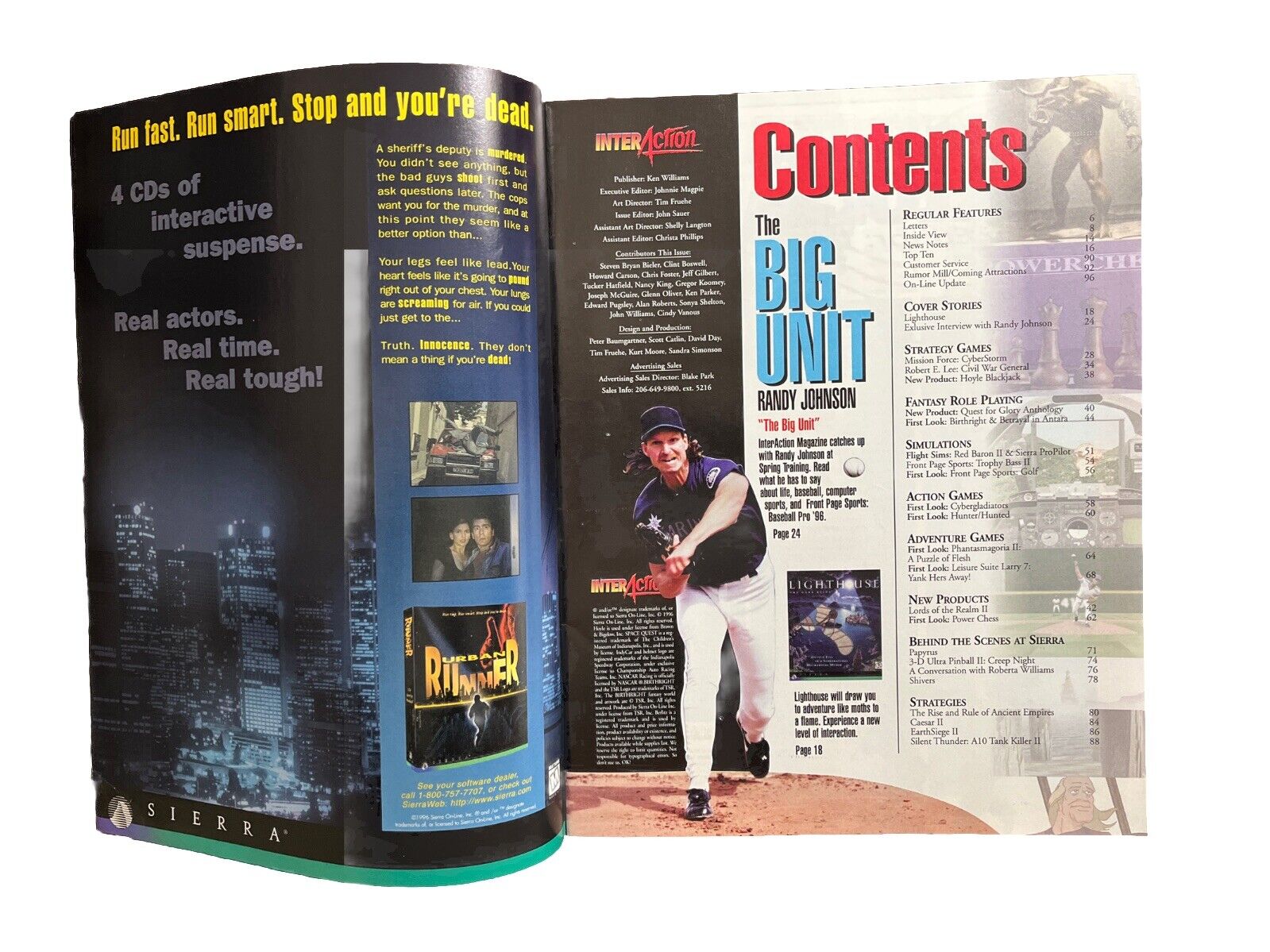 This is a quarterly magazine called Interaction that was published in the summer of 1996. The cover features Randy Johnson and the magazine includes articles and activities related to video games, fantasy, and fiction. It was published in the United States and is written in English.