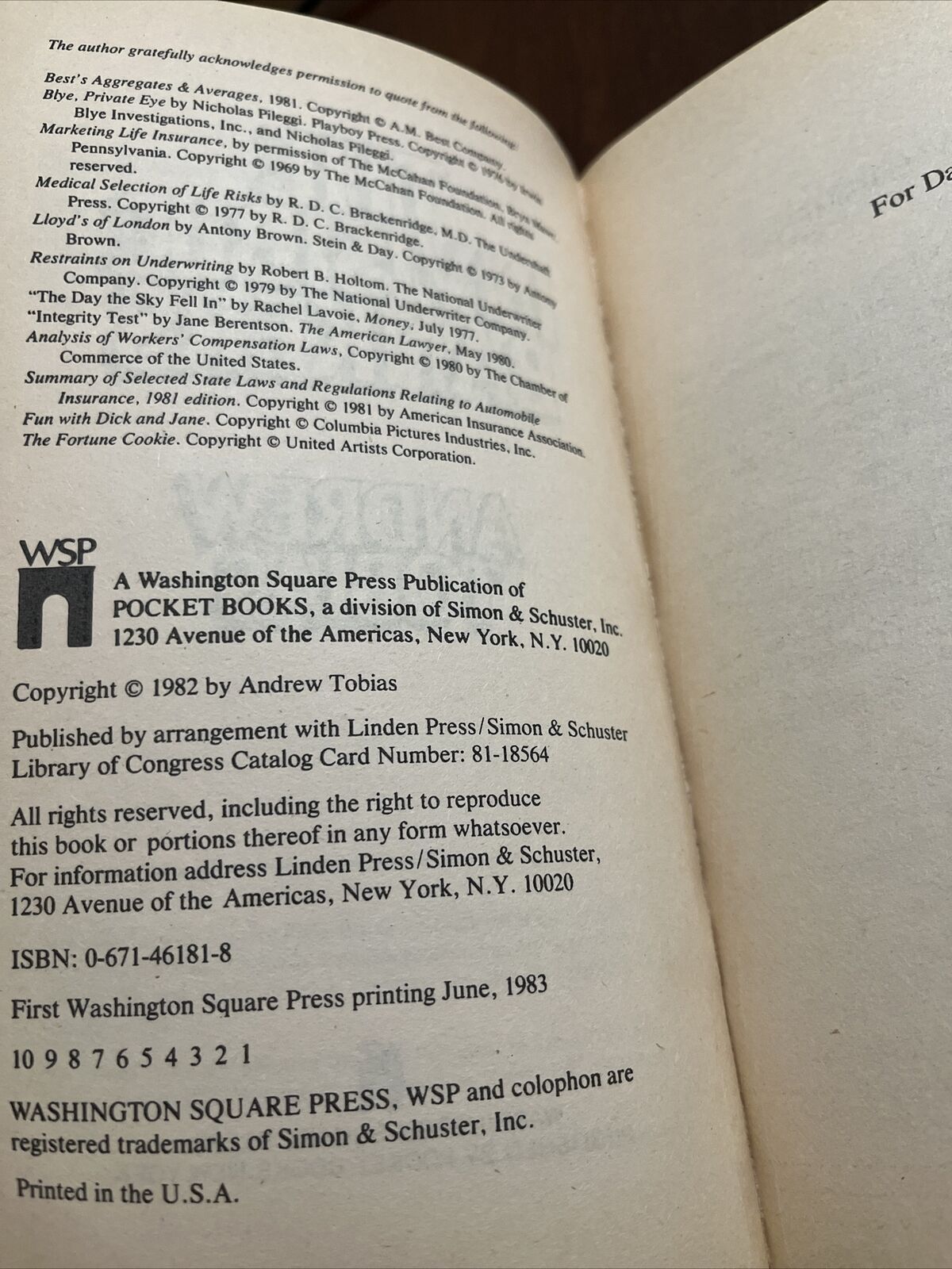 This book, titled "Invisible Bankers: Everything the Insurance Industry Never", is a nonfiction narrative written by Andrew Tobias in 1983. It was published by Washington Square Press by Pocket Books in the United States and weighs 7.2 ounces. The book is a paperback with a mass market format and has 404 pages.