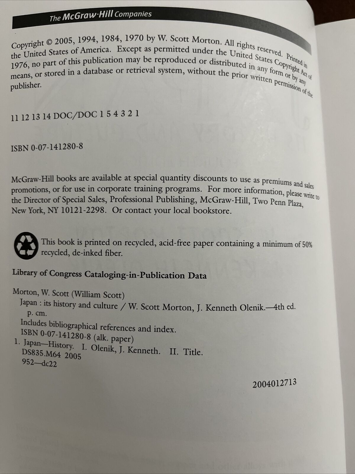 This textbook, titled "Japan: Its History and Culture" by Scott W. Morton, offers an in-depth exploration of Japan's rich cultural and historical heritage. Published in 2004 by Mcgraw-Hill Education, this 368-page trade paperback provides an insightful look into the country's past and present.