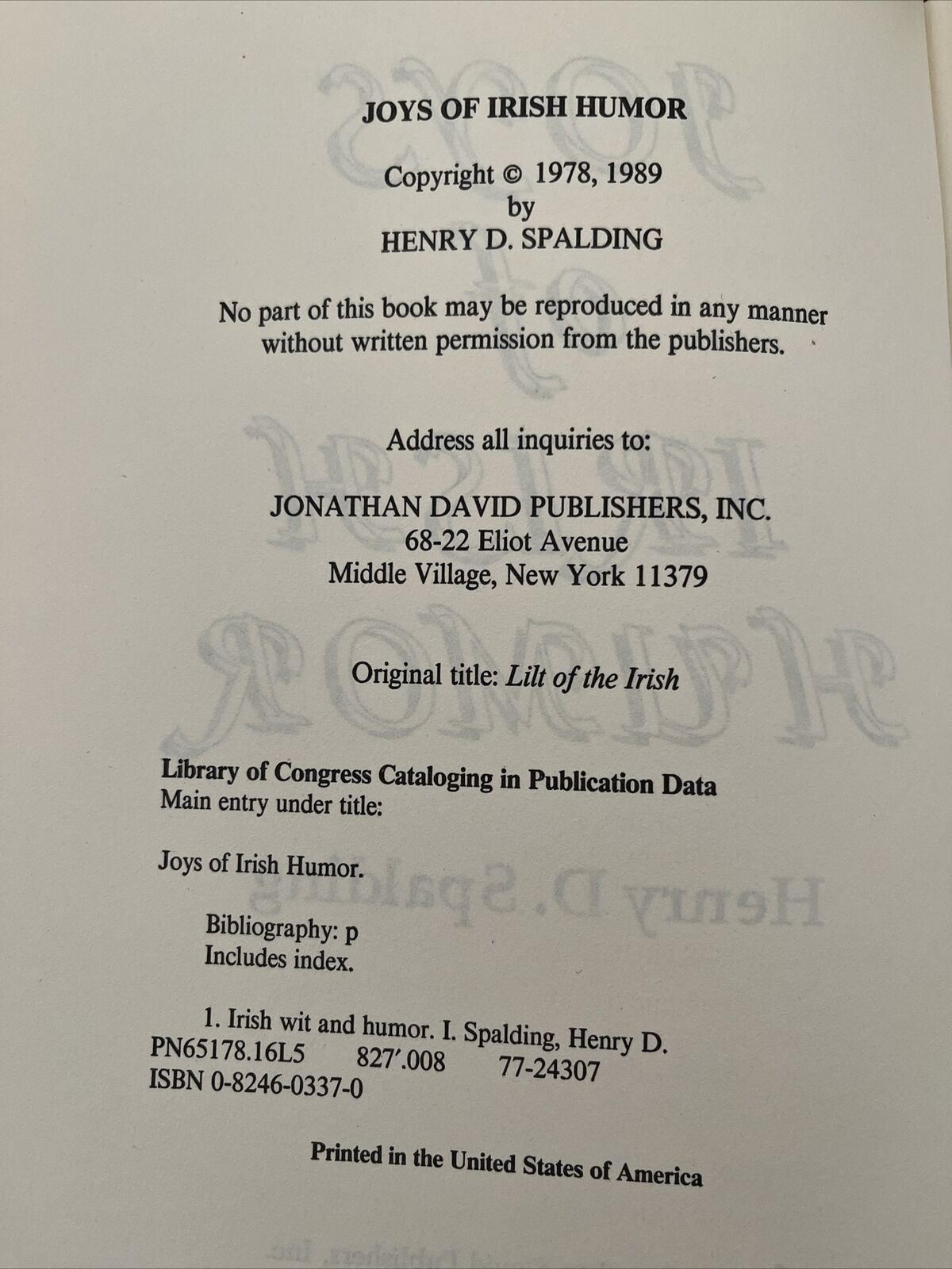 This book titled "Joys of Irish Humor" is a 1989 nonfiction narrative written by Henry D. Spalding. It comes in a hardcover format and was published by David Publishers, Incorporated, Jonathan. The book is written in English, its original language, and has special attributes such as a dust jacket.