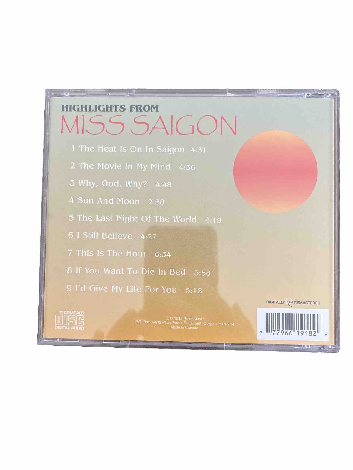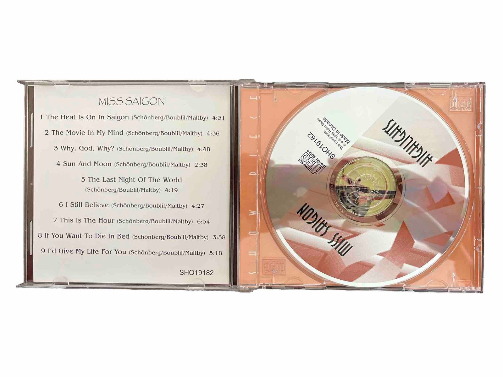 The Miss Saigon (Highlights from the Christopher/Emery Company) CD features the brilliant soundtrack of the popular musical. It is produced by Showpiece and released in 1996. The CD is a must-have for fans of soundtracks and musicals, with a great selection of songs from the original cast.