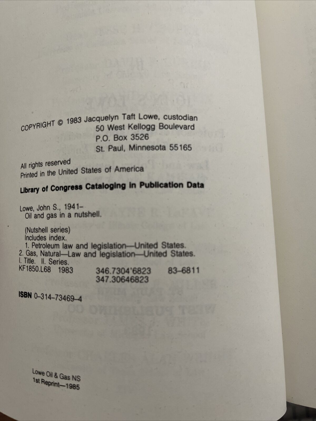 Oil and Gas Law in a Nutshell Nut Shell John S. Lowe 1983 SC 1st Edition