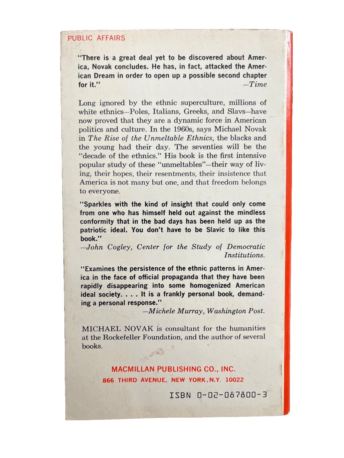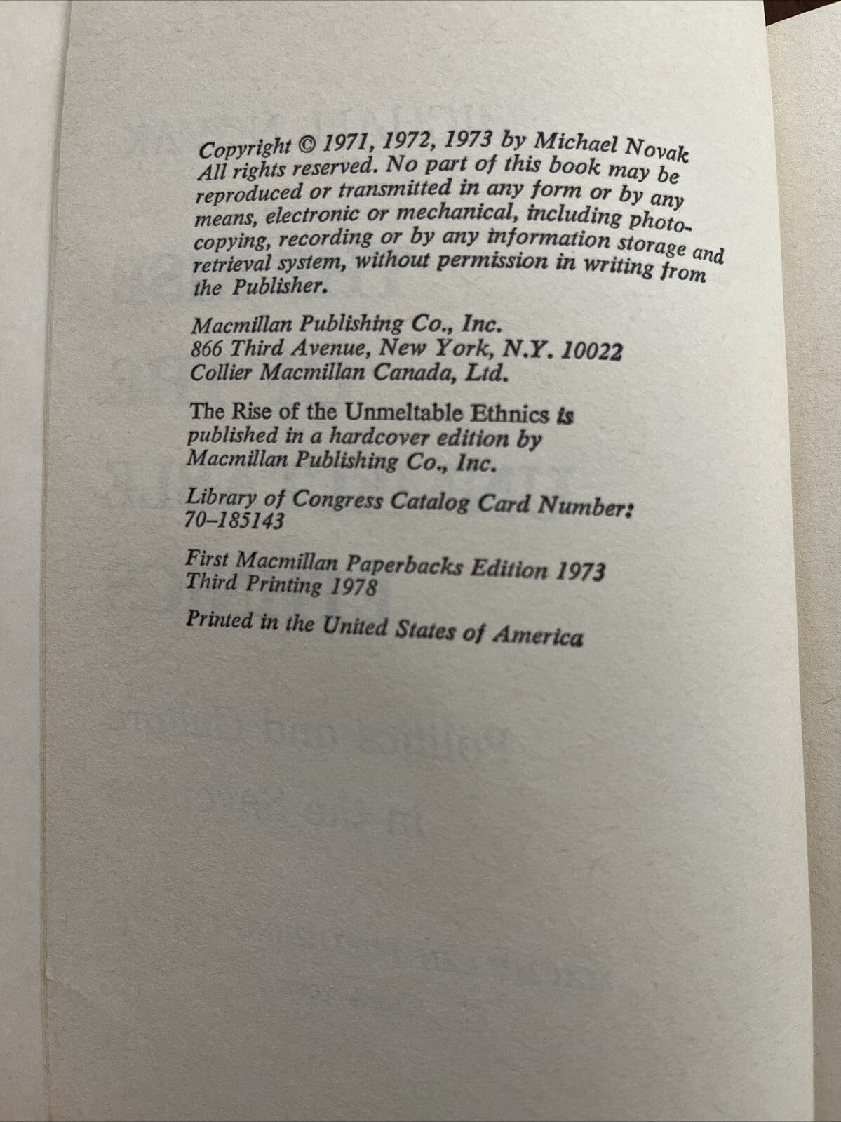 This book, titled "Rise Of The Unmeltable Ethnics" written by Michael Novak, is a nonfiction piece that delves into the topic of public affairs and sociology. It is a bibliography format paperback book published in 1978 and written in English. The book measures 7 inches in height, 5 inches in length, and 1 inch in width, with a weight of 15 ounces.