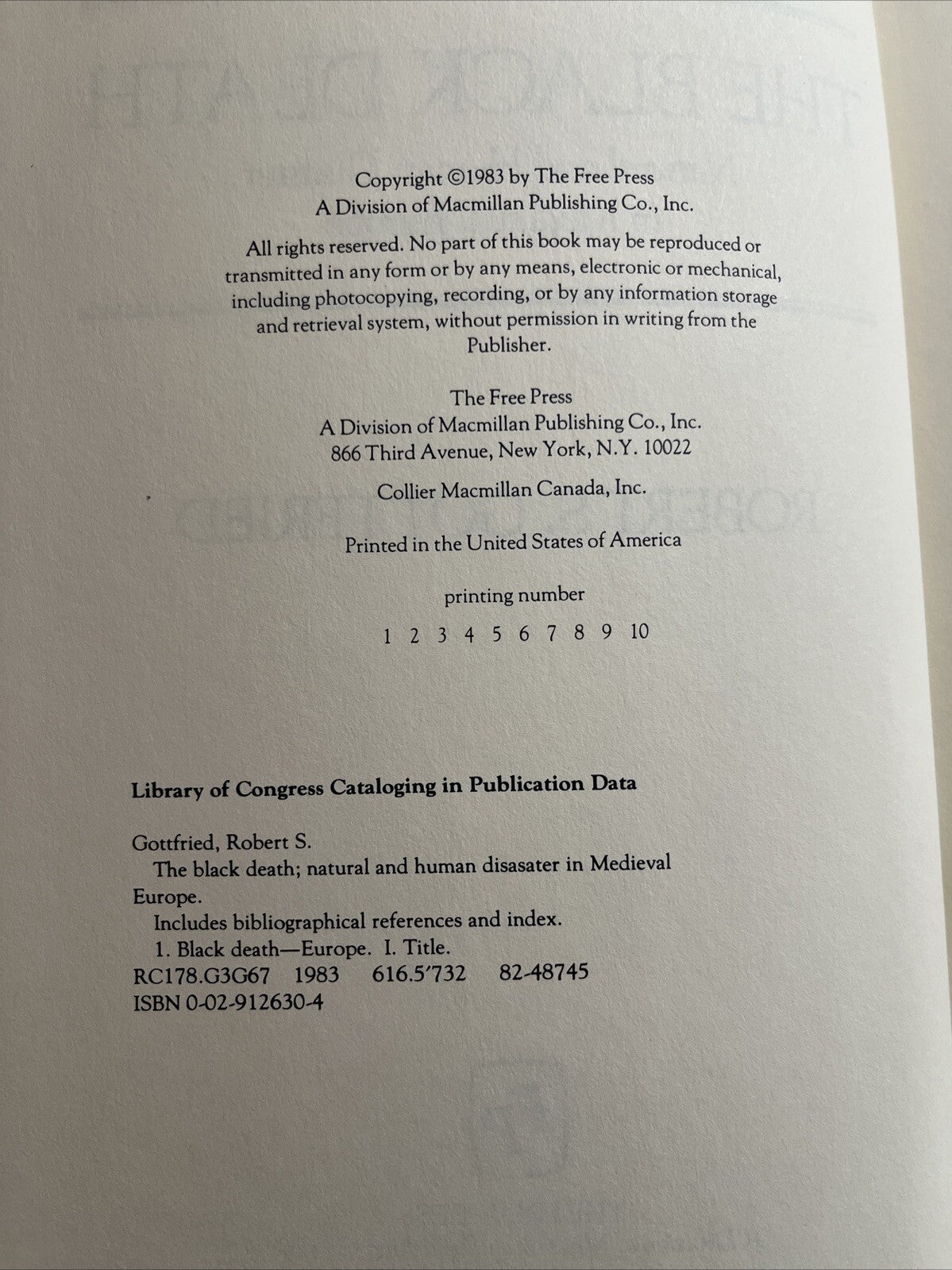 This book is a first edition hardcover textbook titled "The Black Death: Natural and Human Disaster in Medieval Europe" written by Robert S. Gottfried. It covers the history of the Black Death, a devastating pandemic that swept through Europe in the 14th century, and its impact on medieval society. The book is 240 pages long, weighs 20.8 ounces, and is published by Free Press in 1983.